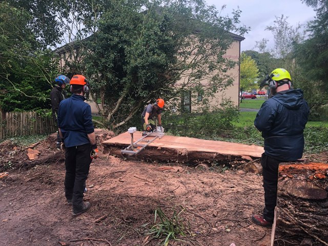 Owner of the business, Keith Irwen, attends the site, alongside a tree surgeon and turns the trunk of the tree into useful timber. This benefits everyone because the carbon that the tree has been locking up throughout its life stays safely in the wood produced.